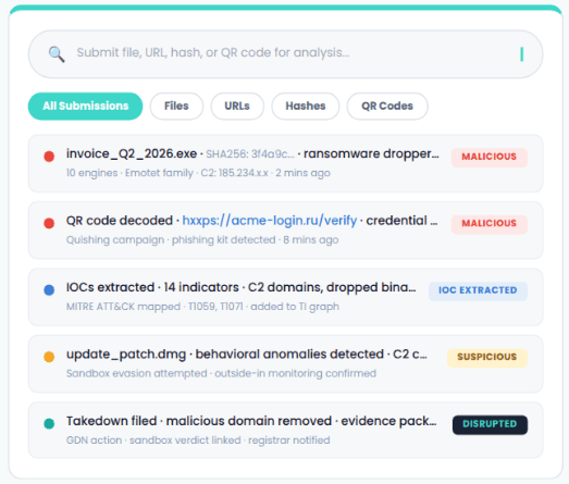 Security teams encounter suspicious files, payloads, and links every day across alerts, investigations, and dark web collection. But they can't act until they know whether the content is actually malicious. Without integrated analysis, teams lose investigation context bouncing between disconnected tools and delay the takedown actions that stop real harm.