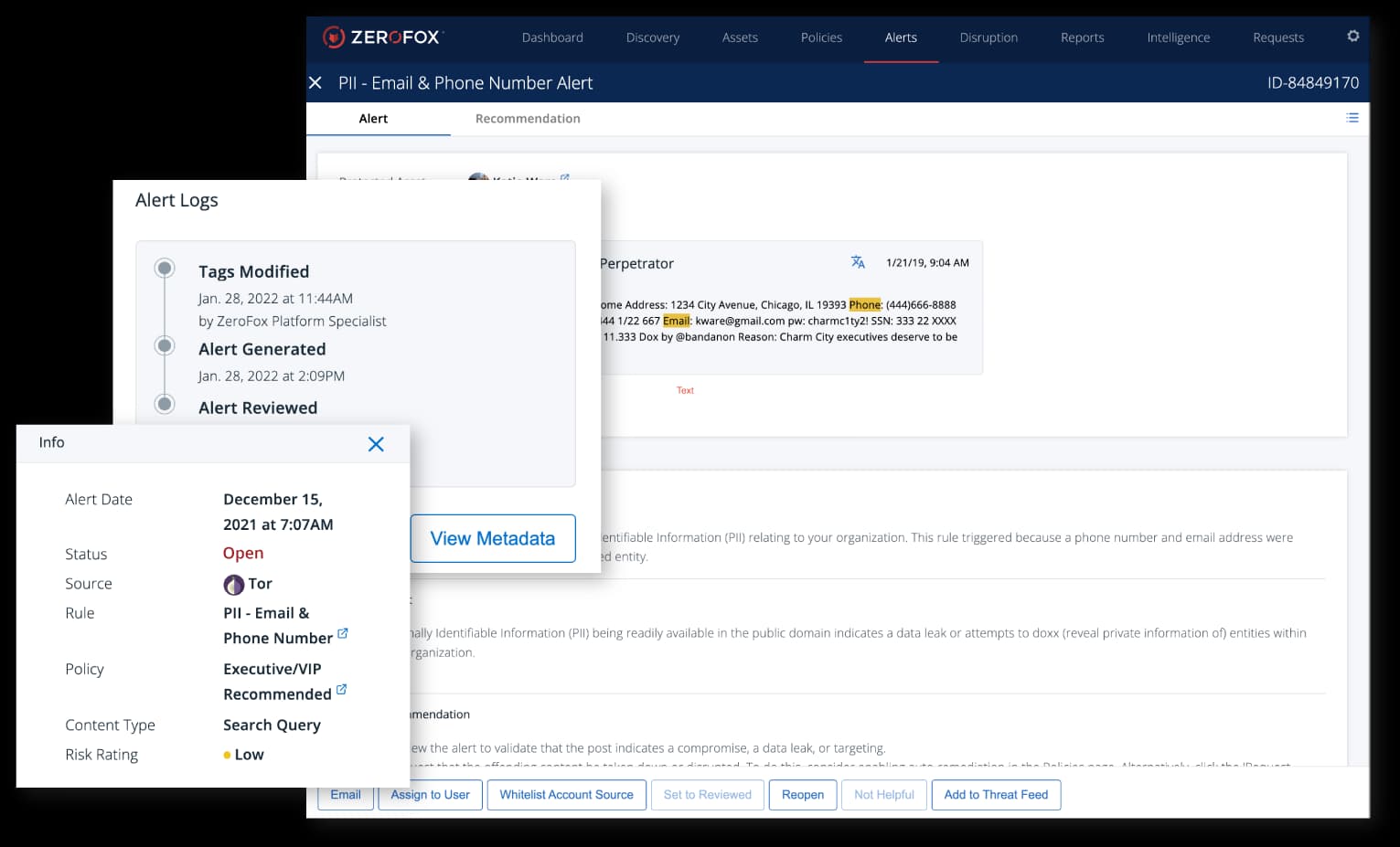 Criminal organizations, state-sponsored threat actors, and individuals operate freely in rapidly growing and evolving peer-to-peer networks like Tor and Freenet. ZeroFox provides human and artificial intelligence with alerts about relevant threats facing your brand, domains, and people on the dark web.