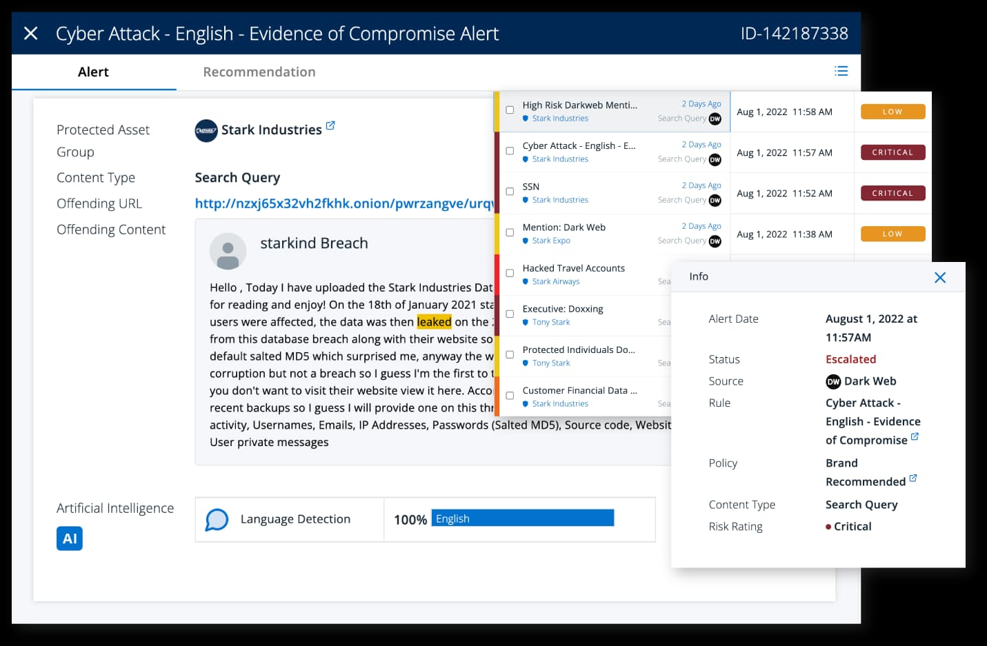 Monitoring the dark web gives you access to the underground dark web forums where cybercriminals coordinate attacks, sell compromised data, and share premade attack tools. Preempt adversaries and prevent attacks with complete dark web monitoring that delivers visibility through both human expertise and AI intelligence.