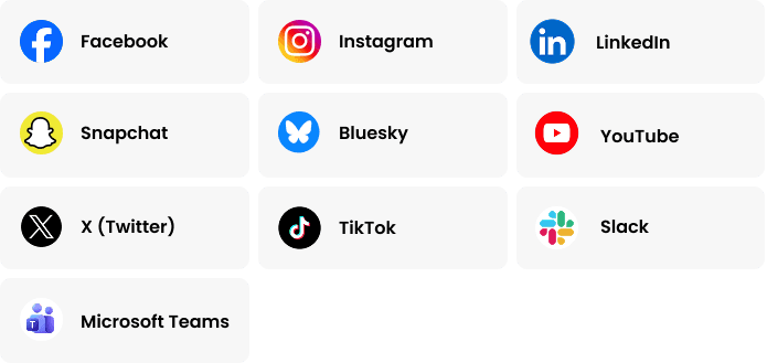 Monitor the platforms where impersonation, brand abuse, and social engineering attacks originate, from major networks to enterprise collaboration tools.
