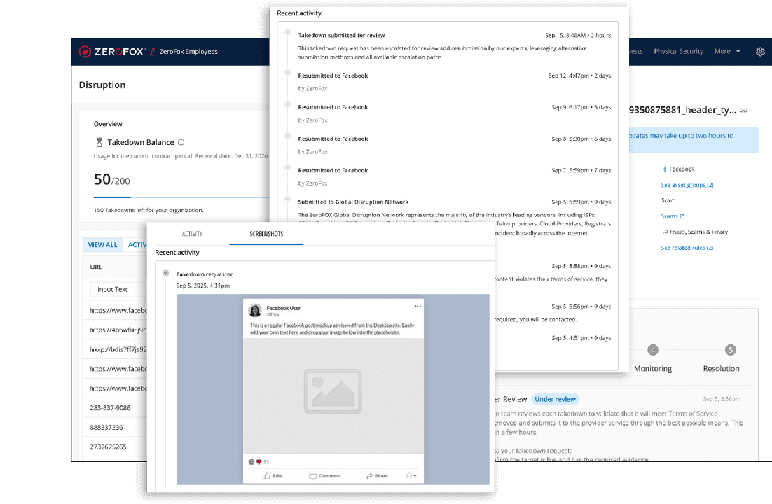 ZeroFox combines automated detection, in‑house analyst review, and a global partner network to remove threats at speed and scale. This hybrid model minimizes exposure, ensures consistency, and provides verified removal evidence.
