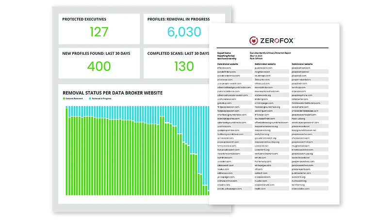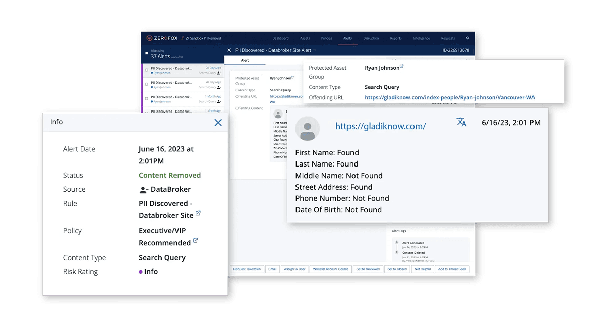 ZeroFox PII Removal + Doxxing Response is built for Corporate Security programs that treat doxxing as a safety risk, not a privacy inconvenience. It identifies where executive PII is listed online and operationalizes removal across broker sites. The result is less fuel for social engineering, doxxing, and physical targeting.